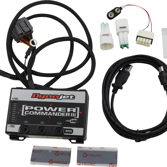 Caracteristicas: Each unit includes a built-in microprocessor and a specific map designed to improve engine performance over stock; Dynojet continuously maps new calibrations for each bike for downloading at their web site(www.powercommander.com) USB (Universal Serial Bus) port provides an instant and automatic connection to the Power Commander Control Center software; simply power up the unit and connect the PCIII USB to the computer with the supplied cable Provides precise information for fine-tuning a fuel-injected motorcycle when changing an air filter, installing a new exhaust system or doing additional engine performance modifications Direct injector control technology manages the fuel curve on models that do not have the sensors to monitor fuel adjustment OEM-style wiring connectors with improved harness protection are supplied; no wiring modifications required If you do not have a computer, you can change the settings with three touch buttons on the faceplate Features an expansion port for future add-on modules from Dynojet Software is compatible with Windows 2000/XP/Vista and Windows 7 USB special cable and 9V battery power adapter are included Includes easy-to-follow instructions Made in the U.S.A.