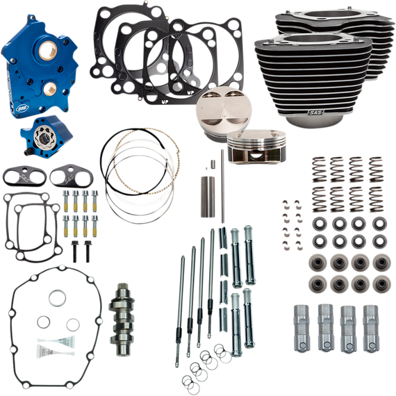 Caracteristicas: Big Bore Kit: 107" to 124" Big Boar Kit Winkle Black Finish with Fin Highlighting Bolt on kit. No case machining required 4.250" bore Forged Pistons 10.5: Compression Ratio Oil Pump/Cam Plate Precision Machined from Billet Aluminum Blue Anodized Finish Passage Plugs Removable for servicing Independent Scavenge Sections for Flywheel Cavity and Cam Chest Debris Screens in both scavenge pickups Magnet in Cam Chest to help to stop debris from entering oil pump Increased Flow Capacity on both Feed and Scavenge side Adjustable Pressure Relief Valve is adjustable with unit installed in engine Pushrods: Quickee Pushrods Chrome pushrod tubes Tappets: S&S Precision Tappets Tappet Cuffs: Hard Anodized Black Coating Billet Aluminum Construction Stronger than Stock Material eliminates Distortion Improve tappet stability in high lift and high rpm situations Cam: S&S 550 Cam- Designed for Big Bore Applications 550G Gear Drive Cam Gear Drive Kits provide improved cam timing accuracy and eliminate the stock cam chain tensioner Gear Drive kits include outer Drive Gears Valve Springs: Work well with cams up to .605 lift High Performance Conical Single Wire Spring Made in the U.S.A. Not recommended for trike models
