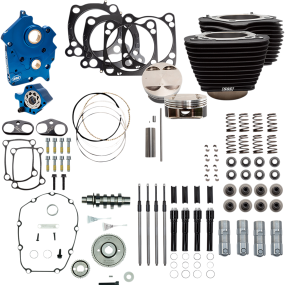 Caracteristicas: Big Bore Kit: 107" to 124" Big Boar Kit Winkle Black Finish without Highlighting Bolt on kit. No case machining required 4.250" bore Forged Pistons 10.5: Compression Ratio Oil Pump/Cam Plate Precision Machined from Billet Aluminum Blue Anodized Finish Passage Plugs Removable for servicing Independent Scavenge Sections for Flywheel Cavity and Cam Chest Debris Screens in both scavenge pickups Magnet in Cam Chest to help to stop debris from entering oil pump Increased Flow Capacity on both Feed and Scavenge side Adjustable Pressure Relief Valve is adjustable with unit installed in engine Pushrods: Quickee Pushrods Gloss Black pushrod tubes Tappets: S&S Precision Tappets Tappet Cuffs: Hard Anodized Black Coating Billet Aluminum Construction Stronger than Stock Material eliminates Distortion Improve tappet stability in high lift and high rpm situations Cam: S&S 550 Cam- Designed for Big Bore Applications 550G Gear Drive Cam Gear Drive Kits provide improved cam timing accuracy and eliminate the stock cam chain tensioner Gear Drive kits include outer Drive Gears Valve Springs: Work well with cams up to .605 lift High Performance Conical Single Wire Spring Made in the U.S.A. Not recommended for trike models