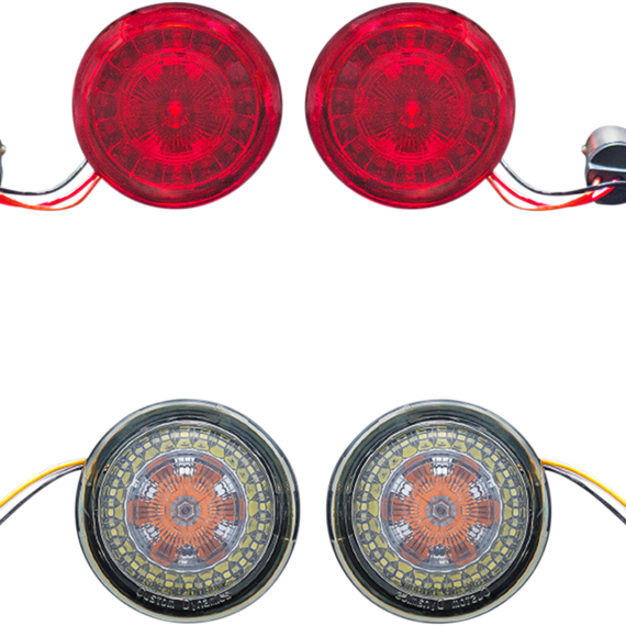 Caracteristicas: Complete front and rear turn signal conversion kitswith smoke lenses in front and red lenses in rear Front turn signals feature a Dynamic Ringz® ProBEAM outer ring of 24 automotive-grade white DRL LEDs, inner circle of 12 high-power automotive-grade amber turn signal LEDs When a turn signal is activated, the white LEDs turn completely off for the entire turn signal cycle, providing greater visibility to the amber turn signal Rear turn signals feature outer ring of 16 automotive-grade red running LEDs and inner circle of 12 high-power automotive-grade red brake/turn signal LEDs Advanced LED lens and reflector design 1157 front and rear pigtail bulb bases SAE and DOT compliant BCM compliant