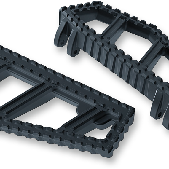 Caracteristicas: Rugged, MX-style floorboards make from durable cast aluminum Serrated tooth top surface provides no-slip secure footing Tapered design provides ample cornering clearance and generous foot room Boards measure 11-3/4"L x 5"W (at widest point) x 1-1/4"H Fits HD models with OEM floorboards Install using OEM hardware