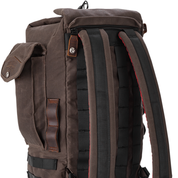Caracteristicas: Leather paneling for support that will age and show character over time Leather-wrapped side grab handle for easy duffel bag mobility Two tie-down straps secure the MOLLE system to most Sissy Bars High quality “moto centric” zippers with metal Burly embossed button snaps and accents "Anti-Flail Snap System” to keep everything secure