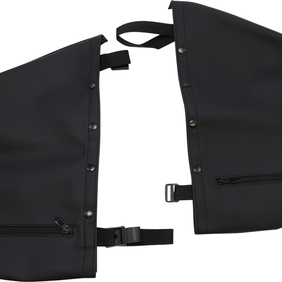 Caracteristicas: Made of Saddlehyde™ with a plush felt inner liner and storage pouch for extra weather protection Marine-grade Saddlehyde™ pushes away the wind to prevent road grime, water and cold air from getting to your legs Snaps on the engine guards in seconds with adjustable nylon webbing lanyard straps and a perimeter steel zipper that sets the opening where you need it for your highway pegs Can also be used in place of the H-D hard fairing lowers Installs quick and fast; includes instructions and mounting straps Designed and made in the U.S.A.