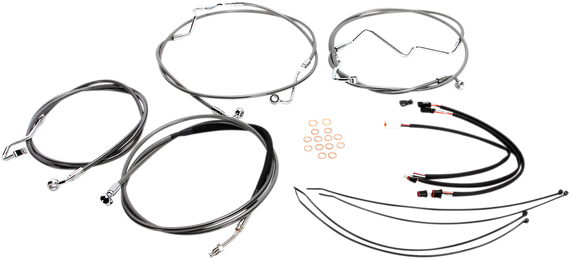 Caracteristicas: Magnum XR Handlebar Installation Kits offer a great fit and excellent quality at an economical price Kit features highly polished, chrome plated fittings All cables are a low effort, high efficiency design that meets or exceeds all OE specifications for fitment, construction, endurance Magnum XR Brake Lines use an enhanced construction of heavy gauge stainless steel embedded in tough abrasion resistant nylon outer jacket for superior durability and extreme braking response for safe riding The coating on cables and brake lines offers exceptional protection for paint or chrome Kits that include manifolds use an all brazed construction to ensure optimal OE fitment and appearance Manifolds use -3 AN connections for an easy installation Kits include throttle and idle cables or throttle-by-wire extensions, clutch cable or XR hydraulic clutch line, XR brake lines, copper crush washers, hardware, turn signal and switch wiring extensions Kits are based on using ape hanger style handlebars and 2" risers.