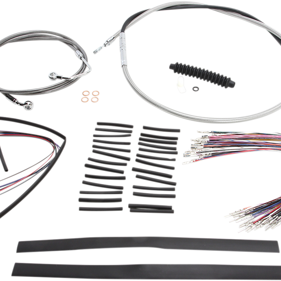 Caracteristicas: Magnum XR Handlebar Installation Kits offer a great fit and excellent quality at an economical price Kit features highly polished, chrome plated fittings All cables are a low effort, high efficiency design that meets or exceeds all OE specifications for fitment, construction, endurance Magnum XR Brake Lines use an enhanced construction of heavy gauge stainless steel embedded in tough abrasion resistant nylon outer jacket for superior durability and extreme braking response for safe riding The coating on cables and brake lines offers exceptional protection for paint or chrome Kits that include manifolds use an all brazed construction to ensure optimal OE fitment and appearance Manifolds use -3 AN connections for an easy installation Kits include throttle and idle cables or throttle-by-wire extensions, clutch cable or XR hydraulic clutch line, XR brake lines, copper crush washers, hardware, turn signal and switch wiring extensions Kits are based on using ape hanger style handlebars and 2" risers.