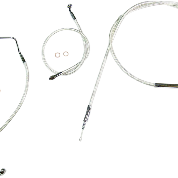 Caracteristicas: Complete kits with matching braided cables and brake lines Kits include throttle and idle cables of throttle-by-wire extensions, clutch cable or hydraulic clutch line, brake lines, copper crush washers, hardware, and any necessary switch wiring of turn signal extension All cable and brake lines feature Sterling Chromite II braid with highly polished chrome plated fittings All cables are a low-effort, high-efficiency design that meets or exceeds all OE specifications for fitment, construction and endurance Kits for dual disc models include an all brazed manifold that eliminates leaks, alignment problems and unattractive threaded connections Assembled in the U.S.A. Kits are based on using ape hanger style handlebars with 2” risers