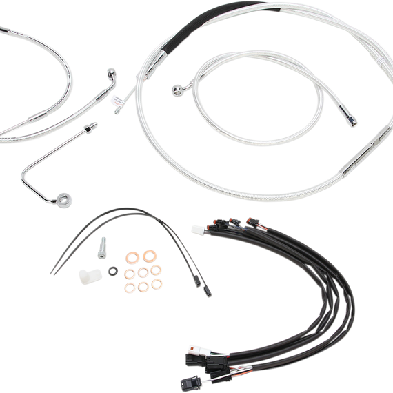 Caracteristicas: The only complete Handlebar Kits with matching braided cables and brake lines that include Magnum Caliber Handlebars Magnum 1-1/4" Caliber handlebars are manufactured with the highest quality construction, including machined control mounts (not swaged) and feature high luster finish for an unsurpassed appearance All handlebars are 1-1/4" diameter with 1" diameter center section and 3-1/2" on-center knurling, work with standard controls, including hydraulic clutch, and are machined for internal wiring and electric throttle control All Caliber Handlebars are preloaded with E-Z pull-thru sleeving to make wiring installations a breeze Kits include: Magnum 1-1/4" Caliber Handlebars, throttle and idle cables or throttle-by-wire extensions, a clutch cable or hydraulic clutch line, brake lines, copper crush washers, hardware, and any necessary switch wiring or turn signal extensions All cables are a low effort, high efficiency design that meets or exceeds all OE specifications for fitment, construction, endurance Kits for dual disc models include an all brazed manifold that eliminates leaks, alignment problems, and unattractive threaded connections Brake lines exceed all DOT FMVSS-106 requirements Assembled in the U.S.A. Caliber Handlebars have a 1" diameter center section and fit 1" risers. Models originally equipped with handlebars that have a center section diameter larger than 1" will require changing the risers to a 1" ID version. Examples would be, but not limited to FLSTF, FLSTFB and CVO models. Please check before ordering.