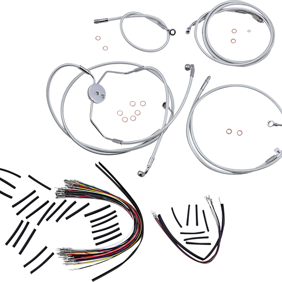 Caracteristicas: Complete kits with matching braided cables and brake lines Kits include throttle and idle cables of throttle-by-wire extensions, clutch cable or hydraulic clutch line, brake lines, copper crush washers, hardware, and any necessary switch wiring of turn signal extension All cable and brake lines feature Sterling Chromite II braid with highly polished chrome plated fittings All cables are a low-effort, high-efficiency design that meets or exceeds all OE specifications for fitment, construction and endurance Kits for dual disc models include an all brazed manifold that eliminates leaks, alignment problems and unattractive threaded connections Assembled in the U.S.A. Kits are based on using ape hanger style handlebars with 2†risers