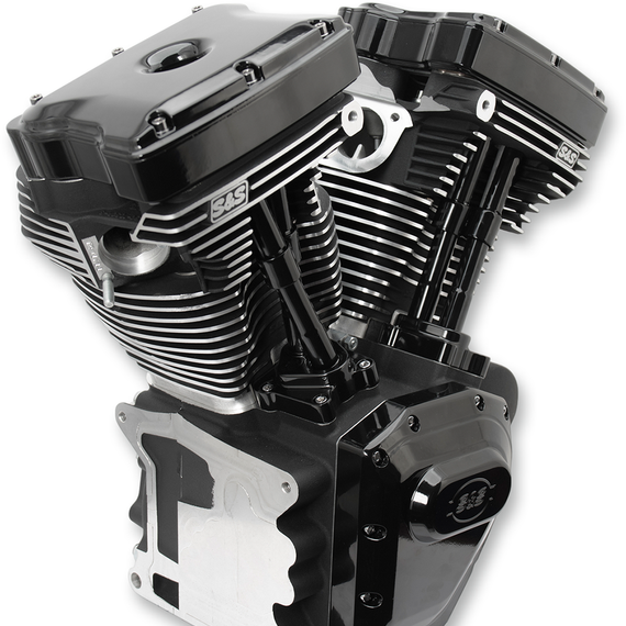 Caracteristicas: Lower Compression, 10.2:1, for great street torque Includes Super Stock heads, T2 crankcase, high flow oil pump, cam cover and easy start gear drive cams Stock Twin Cam 96 bolt pattern Specs: displacement 124"; bore 4-1/8"; stroke 4-5/8"; 585 cam; piston type S&S forged dish 11cc No fuel system or ignition systems included Special head machining fits stock length intake manifolds (S&S manifold size 405) Stock style breathing system; compatible with stock and most performance air cleaners Oil line installation kit required. Cylinder heads on T-Series long block engines are 99-05 style. Owners of 06 models will need to purchase a set of 99-05 style, offset intake flanges. Cylinder heads on these engines are specially machined to compensate for the non-stock cylinder length. As a result, they are compatible with manifolds and throttle bodies with stock length intake runners. In addition, the breather vent bolt locations have been adjusted so they are in the stock location, so stock style air cleaner back plates will bolt up to these engines.