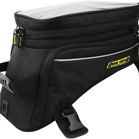 Caracteristicas: V-shaped base to accommodate off-road, dual-sport and adventure motorcycles New quick release makes for quick mounting and refueling Top quality UltraMax™ polyester with maximum UV protection Convenient side pockets to hold smaller items for easy access Bag maintains shape, has reflective piping and a lined interior Reverse coil zippers help keep out dust and dirt, keeping zippers working smoothly Adjustable shoulder/tether strap Protective base material prevents slipping or marking Clear map pocket is touch screen device friendly Main compartment measures: 12”L x 7”W x 9”H Standard, 12”L x 7”W x 12”H Expanded Holds 12.39 Liters / 16.52 Liters expanded