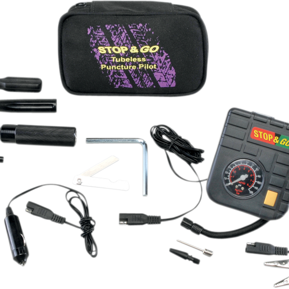 Caracteristicas: Ideal for motorcycles, scooters, mowers, small tractors, golf carts and ATVs Kit allows you to make an on-the-wheel repair to your tubeless tire and re-inflate it on the spot Includes the Pocket Tire Plugger with 15 mushroom-shaped rubber plugs and the compact mini air compressor Mushroom plugs measure 5/16" diameter shaft x 3/4" in length and work on all tubeless tires Kit fits into a durable zippered canvas case that measures only 7" x 4" x 3" and weighs just 1.7 lbs 12 Volt compressor unit features built-in gauge and LED Light, 66" power cord that fits Battery Tender connectors, 12" alligator extension clips, 36" extension lighter adapter and 4" tire valve hose with sports needle and inflatable adapter