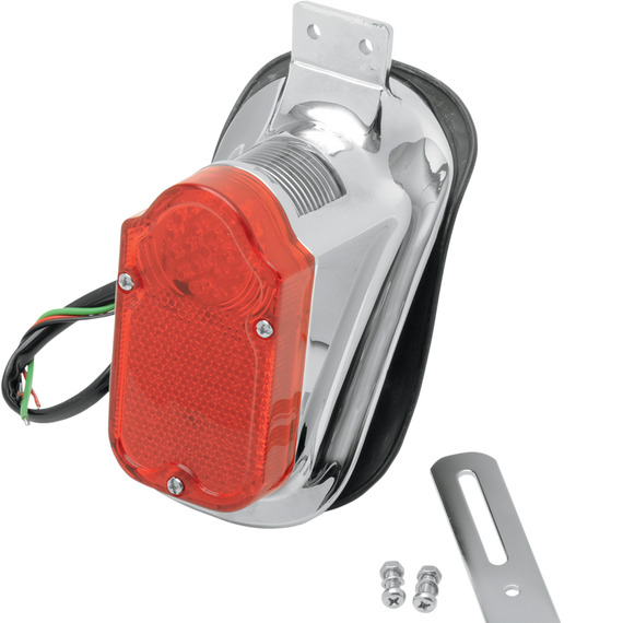 Caracteristicas: Chrome housing with red lens and top tag light Includes a top license plate mount Lens measures 4-5/8" x 2-1/2" Dual-function LED 41/4" on-center mounting holes Not DOT or ECE compliant