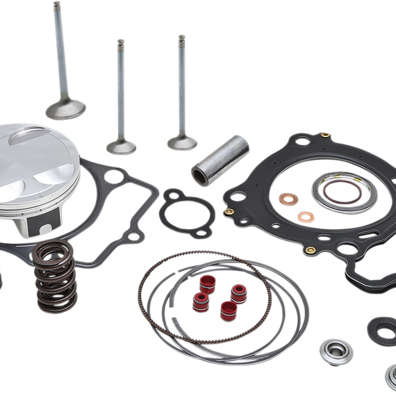 • Kit includes all necessary parts for a complete top-end service/rebuild: pistons, piston rings, piston pins, gaskets, valves, and valve springs