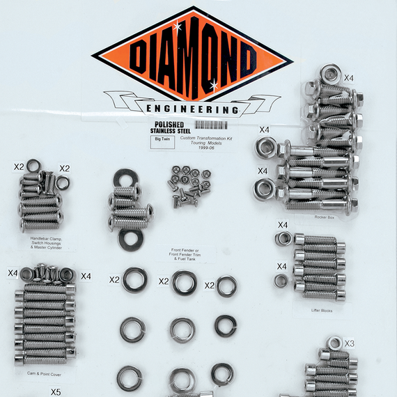 Caracteristicas: Customize a bike without having to completely disassemble it Groups of polished stainless steel fasteners covering the engine, transmission and the most visible areas of the motorcycle Kits add detail and a custom look with ease Kits include fasteners for primary, inspections and inner primary; cam and points; oil pump or oil line cover, filter mount and sensors (Dyna and Twin Cam FLHT) or oil filter plugs and sensors (Softail Twin Cam); lifter blocks; rocker box; coil and circuit breaker covers (Dyna); transmission side cover; oil filler (FLHT models); transmission top cover; handlebar clamp, switch housings and master cylinder; front fender or front fender trim and fuel tank (FLHT models); rear fender rail or swingarm pivot blocks and rear floorboard brackets (FLHT models) Made in the U.S.A.