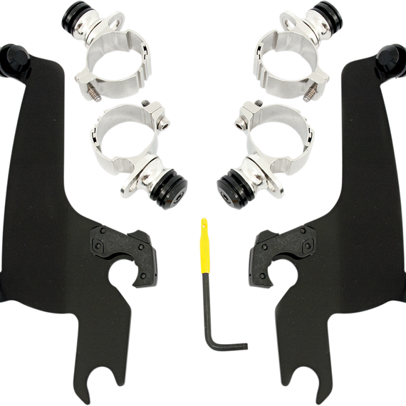Caracteristicas: The revolutionary No-Tool Trigger-Lock mounting kits feature a detach system that allows you to quickly and easily remove or swap out your Sportshield without the use of any tools A pair of latches lock the windshield down until the spring loaded "trigger locks" are intentionally disengaged, allowing the rider to remove the windshield Kits are a combination of CNC-machined aluminum plates and anchors, stainless steel hardware, gray polymer bushings and glass-filled nylon latches or "Night Shades" black version which, is a gradient black windshield with black E-coated stainless steel straps, fittings and hardware for a black-on-black sinister look Kits are custom-fit to each style of bike for no-hassle installation