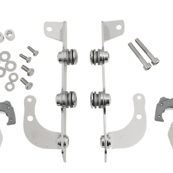 Caracteristicas: The revolutionary No-Tool Trigger-Lock mounting kits feature a detach system that allows you to quickly and easily remove or swap out your Sportshield without the use of any tools A pair of latches lock the windshield down until the spring loaded "trigger locks" are intentionally disengaged, allowing the rider to remove the windshield Kits are a combination of CNC-machined aluminum plates and anchors, stainless steel hardware, gray polymer bushings and glass-filled nylon latches or "Night Shades" black version which, is a gradient black windshield with black E-coated stainless steel straps, fittings and hardware for a black-on-black sinister look Kits are custom-fit to each style of bike for no-hassle installation