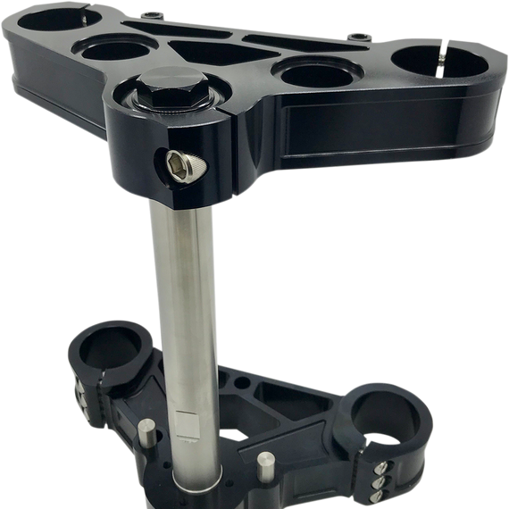 Caracteristicas: CNC-machined out of solid 6061-T6 aluminum Increased clamping area of 0.25” on the bottom tree reduces lateral and torsional fork flex, which increases the rigidity and stability of the front end Machined cut-out in top tree for clean cable and wire routing No fork lock capabilities Will fit most 39 mm front ends with 7” O.C. forks Designed to accept standard risers (3-1/2” O.C.) Models with risers cast into the upper triple tree will require separate purchase of risers, bushings and mounting hardware.