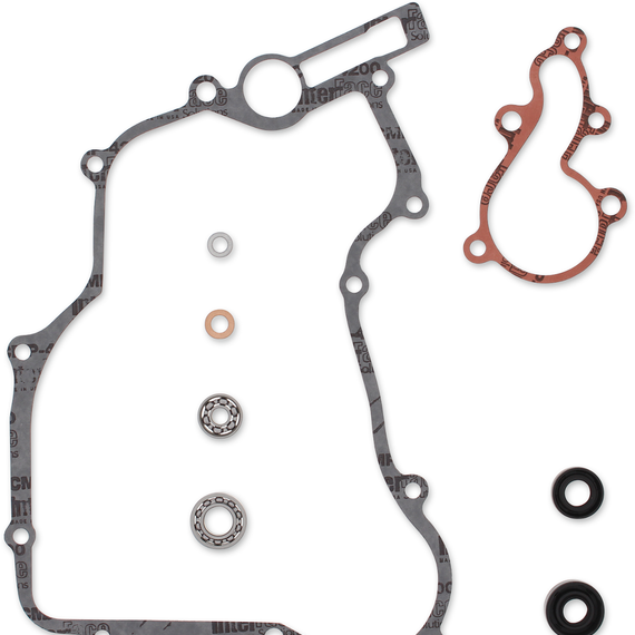 • Typical kit includes the following: bearings where applicable; rubber seals; mechanical water pump seal where applicable; side cover gasket; water pump gasket; snap rings located on water pump shaft and copper drain washers