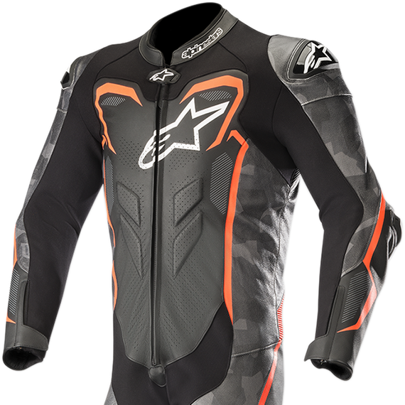 GP Plus v2 Camo 1-Piece Leather Suit - Black/Charcoal/Red Fluorescent - US 44 / EU 54