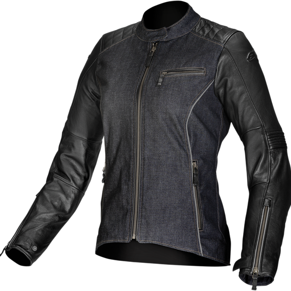 Caracteristicas: Created to ensure optimized female fit Light, removable, performance elbow and shoulder protectors are reduced in thickness to improve styling Supple and durable full-grain leather on sleeves and shoulders Main outer shell constructed from indigo denim Leather accordion inserts strategically positioned on elbows Contemporary styled, low-profile collar Snap closures on collar and cuffs for easy, secure fastening Leather detailing around pocket openings, plus auto-locking zips with leather pull-tabs External zippered pocket, plus internal waterproof pocket Embossed logos on shoulders Reflective piping to the front and rear improves rider visibility