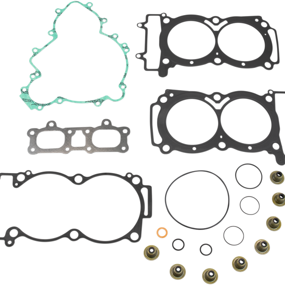 Caracteristicas: Superior-quality gasket sets from Athena Head gaskets feature rubber-coated spring steel construction Soft steel base gaskets are rubber coated Steel core materials feature high springback and superior tensile strength Revolutionary transparent coating guarantees a perfect seal even at extremely high temperatures High-temperature blue silicone beading on most critical flat gaskets Includes all necessary top-quality gaskets, rubber parts and valve stem seals to rebuild top-end and complete engines respectively Oil seals not included