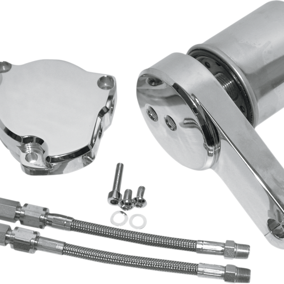 Caracteristicas: Eliminates the need to remove the exhaust system Comes pre-assembled by trained technicians to reduce costly errors and helps ease the installation process #8 lines that equal or exceed factory specifications for ideal oil flow Braided stainless steel lines with chromed, threaded compression-sealed valves (not hose clamps) For improved oil filtration, a high-quality chrome oil filter with magnetized center is included Manufactured from T-6061 billet aluminum Works with engine guards Easy to install and can turn a 1-1/2 hour oil change into a 20-minute job