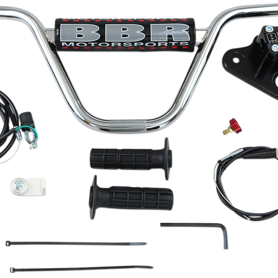 • Includes billet triple clamp, 8" rise handlebars, cable set throttle assembly brake lever, kill switch, bar pad, grips, carb top, 6mm Allen wrench and grip glue