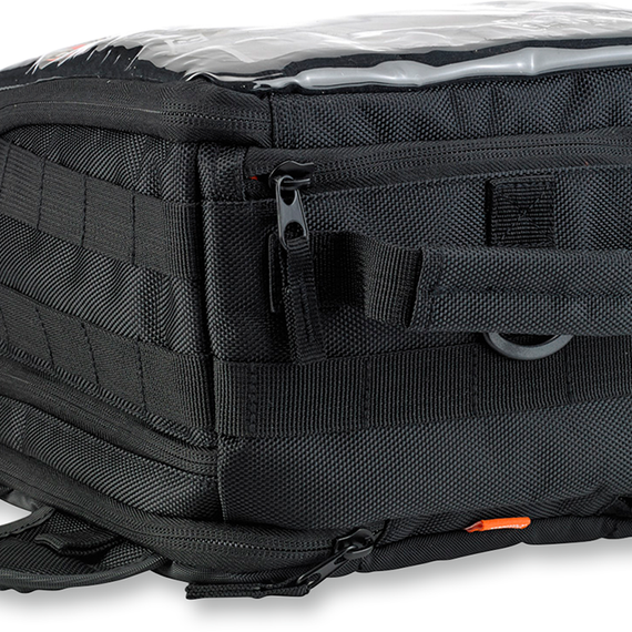 Caracteristicas: Biltwell's answer to the ubiquitous motorcycle tank bag Padded main compartment holds up to 11 12-oz. cans Attaches with magnets that are strong enough to hold the bag in any condition and at high speeds, regardless of whether the bag is loaded or empty Multiple attachment points if you'd like to use your own "dummy cord" or otherwise strap it to your bike Dimensions: 9" W at top and 7" W at bottom x 11" L x 6" H at front and 4" H at rear