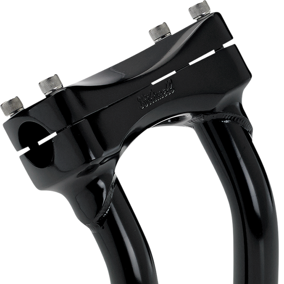 Caracteristicas: Investment-cast one-piece steel bar clamp accepts 1-1/8-inch O.D. handlebars 0.120-inch (3mm) wall x 1" O.D. 4130 chromoly uprights CNC lathe-turned mounting bases accept 1/2-13 t.p.i. stock and aftermarket mounting hardware Mounting holes on 3.5-inch centers to fit most stock and select aftermarket H-D fork trees Pullback Murdock risers feature mandrel-bent uprights for two inches of rearward bar offset—perfect for reducing reach for shorter riders TIG welded and hand polished before polishing Stainless-steel 5/16-18 t.p.i. bar clamp hardware