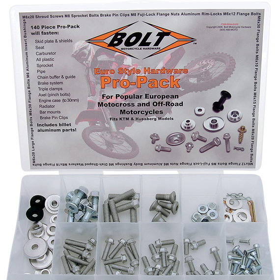 • Includes over 145 pieces of M6 and M8 dimpled flange bolts, concave washers, carb screws, shroud screws, sprocket bolts, Brembo style brake pin clips, three sizes of bushings, rim-lock spacers, drain plug washers, sub-frame bolts, M5 dimpled flange bolts, and valve stem grommets