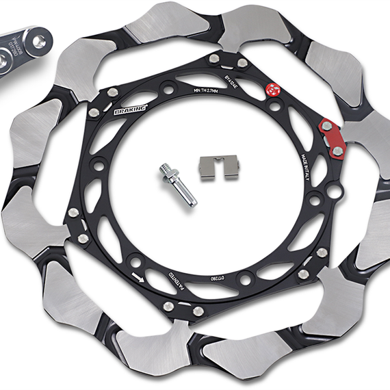 Caracteristicas: Designed with input from Braking's working experience with best teams in most important competitions in the world (MXGP and MX2) The braking track ensures a better heat dissipation, ensuring a steady friction coefficient The new connection structure allows a more controlled a radial axial play, with a better load transfer between the braking track and the carrier Thermal design optimized Maximum weight-to-performance ratio Consistent disc temperature Absence of heat spots Direct load transfer between rotor and hub No pin deformation due to applied load