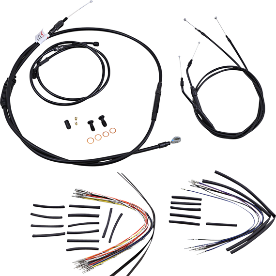 Caracteristicas: Complete installation kit for Burly Ape hangers Kits include extended brake line (unless noted), extended clutch cable/clutch line, extended throttle/idle cables as required and all necessary wiring Brake lines, when included, feature PTFE inner liner and heavy-duty stainless steel outer braid Dresser kits reuse stock Throttle-By-Wire harness Kits are based on using 2" risers with ape hanger-style handlebars