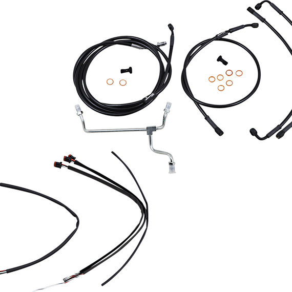 Caracteristicas: Complete installation kit for Burly Ape hangers Kits include extended brake line (unless noted), extended clutch cable/clutch line, extended throttle/idle cables as required and all necessary wiring Brake lines, when included, feature PTFE inner liner and heavy-duty stainless steel outer braid Dresser kits reuse stock Throttle-By-Wire harness Kits are based on using 2" risers with ape hanger-style handlebars