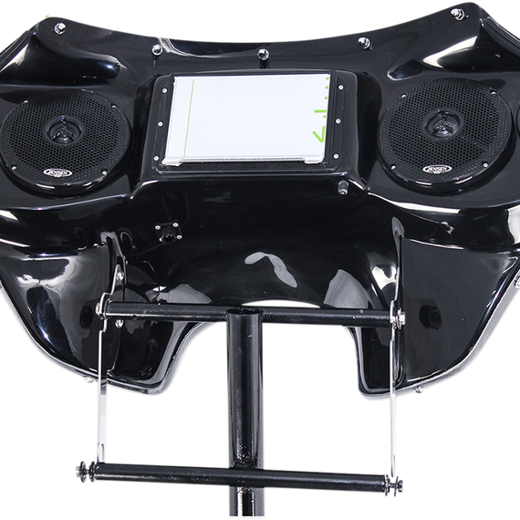 Caracteristicas: Gloss black inner and outer fairings ready for your painter Jensen JRV9000 head unit Built-in navigation 6.2" high definition TFT LCD screen Bluetooth®/USB/HDMI/audio-video input CD/MP3/WMA AM-FM DVD IPod®/IPhone® SiriusXM® ready Camera compatible for up to three cameras PA mic input Mounting brackets, bushings and hardware Coaxial marine speakers for great sound at any speed with any pipes Includes 12" clear windshield Concealed internal antenna for a clean, uncluttered appearance Weather door and internal shielding to protect the radio from water Superb wind protection and great audio with a classic appearance Hand-laid fiberglass construction These fairings integrate with your OEM windshield mounts and use a quick-detach power cord to go on or off your bike in less than five minutes Made in the U.S.A.