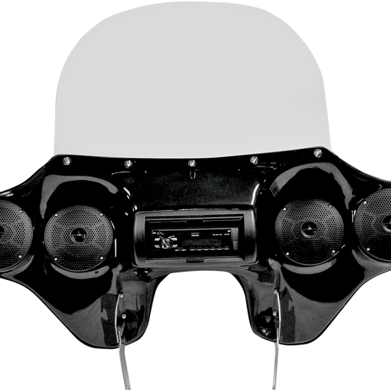 Caracteristicas: Classically styled fairing that delivers the ultimate in sound and wind protection Top-quality hand-laid fiberglass construction, gloss black gel-coated Include Jensen JHD3630BT head unit; features AM/FM/CD/USB SiriusXM capable and iPod Ready stereo with Bluetooth Stereo comes completely assembled with marine-grade weather door and four 5" pre-wired speakers Handlebar control is die cast aluminum and waterproof with rubberized buttons Concealed internal antenna for a clean, uncluttered look Easy quick-detach connection to bike's electrical system Kit includes quick-release brackets to mount on OEM windshield docking points or accessory detachable windshield docking points Includes a 12" clear windshield, will accept 96-13 FLHT OEM style and aftermarket replacement windshields (sold separately) (some drilling and trimming may be required) Made in the U.S.A. Fairings with handlebar control do not come with CD player.