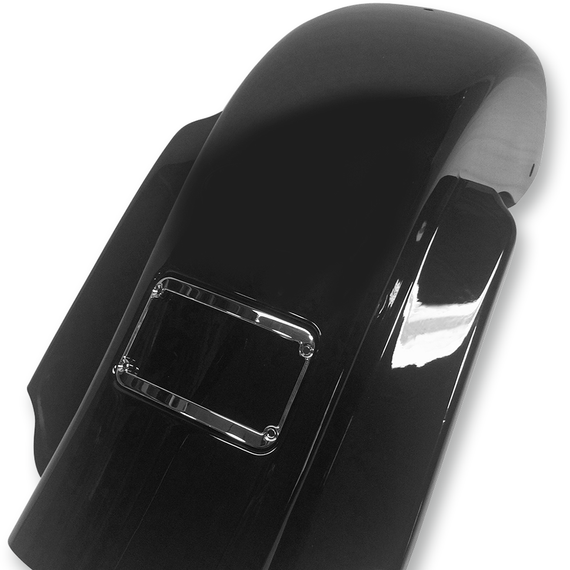 Caracteristicas: Frenched with a frenched license plate pocket An all steel option for those Bagger owners that want that seamless one piece rear end look Stamped 14-gauge steel construction with integrated bag-to-fender filler panels The same deep draw stamping quality as the rest of the Klock Werks sheet metal line Filler panels are 100% TIG welded to fender Filler panels mate up to rear top strut covers perfectly Dual exhaust cut out in the bottom of the filler mate up to extended bag and bag extensions offered in the aftermarket 8.625” wide with 4” stretch Look equally as good without extended bag Accept all stock detachable mounting hardware/brackets Made in the U.S.A. For use with Klock Werks The One Rear Fender Lighted License Frame - see Related Products