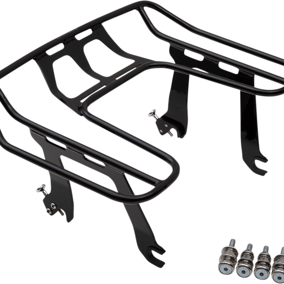Caracteristicas: The top of the rack is about level with the top of the seat and each rack has a kick up in the rear There are places to attach bungee cords or mounting straps so you no longer have to scratch your bike’s fender as you secure your cargo If you are using an aftermarket seat other than the Saddlemen or Lucky Daves step ups, then look carefully at the measurements of the opening to ensure the rack will fit around your bike’s seat They do not work with nor require the Harley-Davidson mounting kits. Mounting hardware included Made in the U.S.A.