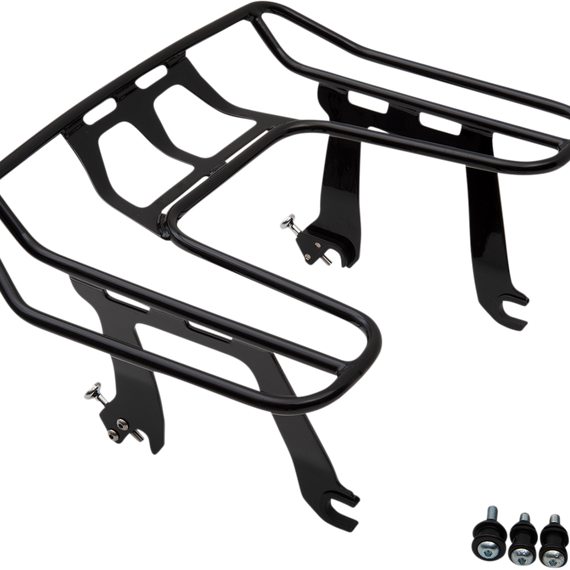 Caracteristicas: The top of the rack is about level with the top of the seat and each rack has a kick up in the rear There are places to attach bungee cords or mounting straps so you no longer have to scratch your bike’s fender as you secure your cargo If you are using an aftermarket seat other than the Saddlemen or Lucky Daves step ups, then look carefully at the measurements of the opening to ensure the rack will fit around your bike’s seat They do not work with nor require the Harley-Davidson mounting kits. Mounting hardware included Made in the U.S.A.