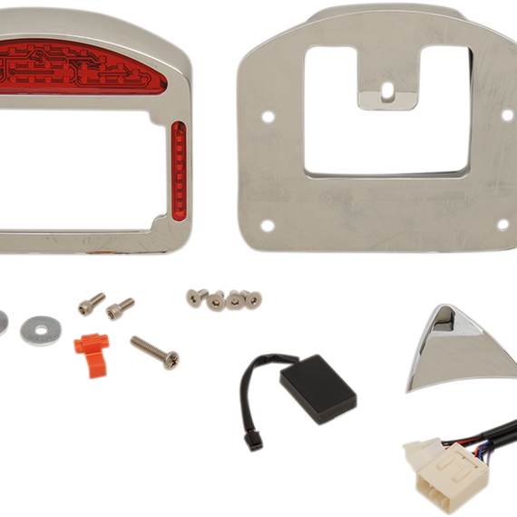 Caracteristicas: Combine several components into one with the Eliminator™ Neatly replaces your existing taillight, turn signal assembly and 4" x 7" license plate mount Taillight assembly has built-in run, turn and brake controller Amber illuminating signals, except 14-15 FLHX Covers all existing holes and no painting required Plug-n-play harness LED lights Aluminum with chrome or black powder-coat finish Not DOT compliant. If bike is equipped with a factory alarm, it may require #2050-0012 (TSSM load equalizer).