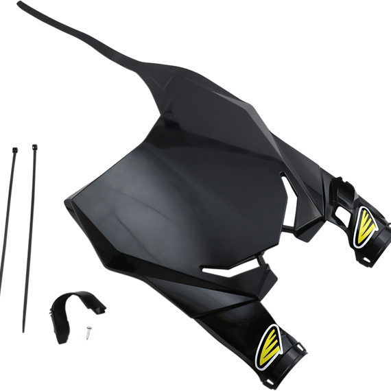 Caracteristicas: Used by factory teams Ultra-lightweight and slim with extra space for stabilizers and bike electronics Includes Works cable guide and a crossbar strap Top mounting; wraps around the fork tubes Older models include upper mounting bracket to fit front mount triple clamps Comes with white and black screens Made in the U.S.A.