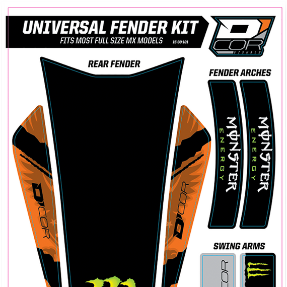 Caracteristicas: Fits most MX full size models Includes graphics for front fender, rear fender, fender arches and swingarm 15 mil decal thickness