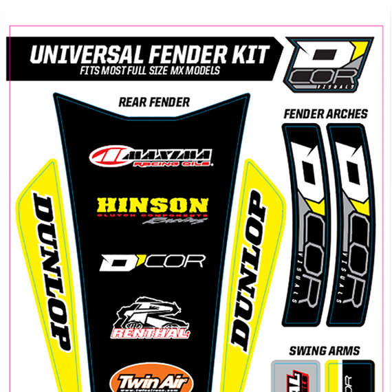 Caracteristicas: Fits most MX full size models Includes graphics for front fender, rear fender, fender arches and swingarm 15 mil decal thickness