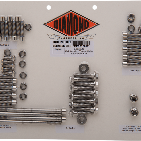 Caracteristicas: Hand-polished stainless steel engine kits are designed to provide a custom and detailed look with easy installation Five groups of fasteners will detail all your engine covers with a lasting shine Diamond Engineering's special hex flange rocker box bolts are included for Twin Cam models Includes fasteners for primary, inspections and inner primary; cam and points; oil pump or oil line cover, filter mount and sensors (Dyna and Touring models) or oil filter plugs and sensors (Softail Twin Cam); lifter blocks; and rocker boxes Made in the U.S.A.