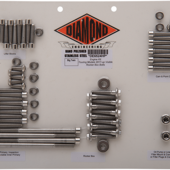 Caracteristicas: Hand-polished stainless steel engine kits are designed to provide a custom and detailed look with easy installation Five groups of fasteners will detail all your engine covers with a lasting shine Diamond Engineering's special hex flange rocker box bolts are included for Twin Cam models Includes fasteners for primary, inspections and inner primary; cam and points; oil pump or oil line cover, filter mount and sensors (Dyna and Touring models) or oil filter plugs and sensors (Softail Twin Cam); lifter blocks; and rocker boxes Made in the U.S.A.