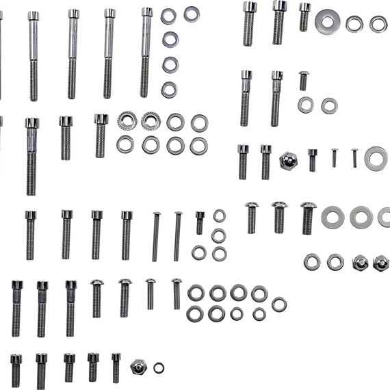 Caracteristicas: Customize a bike without having to completely disassemble it Kit adds detail and a custom look with ease Groups of polished stainless steel fasteners covering many visible areas of the motorcycle Front fender mount and trim, rear saddlebag supports, floorboards, engine guard, triple tree pinch, fork tube covers, axle cap, Wiring harness tab on frame neck, mirrors, kickstand, shifter arm, levers & linkage, brake pedal, Rear master cylinder, mount, cover & brake line bracket, crankcase (visible bolts only), starter Made in the U.S.A.