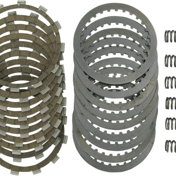 Caracteristicas: Get all the performance without all the fade or slip Get all the performance without all the fade or slip Friction plates are ready to fit - no need to pre-soak in oil Friction plates are ready to fit - no need to pre-soak in oil Designed to ensure ultra-smooth power delivery Designed to ensure ultra-smooth power delivery More durable than OEM clutch plates More durable than OEM clutch plates High-heat friction material for fade-free performance High-heat friction material for fade-free performance Clutch springs are shot-peened for maximum life, heat-treated and precision-wound using only the finest chrome silicon Clutch springs are shot-peened for maximum life, heat-treated and precision-wound using only the finest chrome silicon Springs are individually designed for each application to ensure easy operation and great feel at the lever Springs are individually designed for each application to ensure easy operation and great feel at the lever Kits available with or without steel friction plates Steel friction plates are precision-made using exacting tolerances Steel friction plates are precision-made using exacting tolerances Plates are heat-treated for maximum life Plates are heat-treated for maximum life Will not muddy or contaminate oil Will not muddy or contaminate oil Both styles of clutch kit include friction plates and springs (unless noted in part specific text)