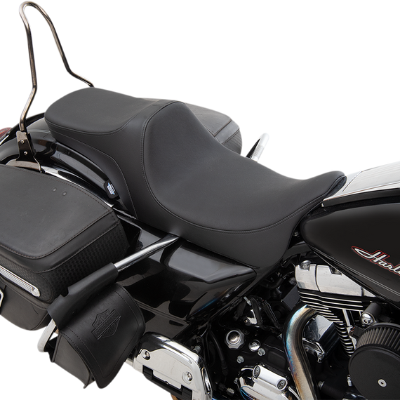 Caracteristicas: Automotive-grade vinyl Molded polyurethane foam for maximum comfort and styling Seat is made narrow up front for better leg clearance 3/16" ABS thermoformed seat base for a perfect fit Fully carpeted bottom to protect paint Fits with all Drag and most H-D sissy bars Made in the U.S.A.