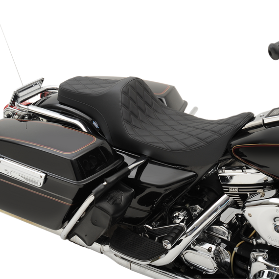 Caracteristicas: Automotive-grade vinyl Molded polyurethane foam for maximum comfort and styling Seat is made narrow up front for better leg clearance 3/16" ABS thermoformed seat base for a perfect fit Rubber bumpers and fully carpeted bottom to protect paint Fits with all Drag and most H-D sissy bars Made in the U.S.A.