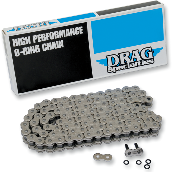 Caracteristicas: Features quad-pin riveting, tough O-ring seals, and solid bushings and rollers Improved wear resistance and strength Average tensile strength 9,500 lb. Weight saving with high tensile strength Pre-stretched at the factory Rivet style master link included Chrome chain features tough chrome plating on side plates