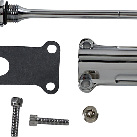 Caracteristicas: Includes dip stick, oil filler spout, oil spout gasket, set screw, socket cap head bolts, and instructions CNC-machined from 6061-T6 billet aluminum and have a thread-in one-piece dipstick which eliminates dipstick blowout on acceleration Custom oil spout allows the use of any starter (that will clear the touring frame) as well as any style bearing door and side cover on the market
